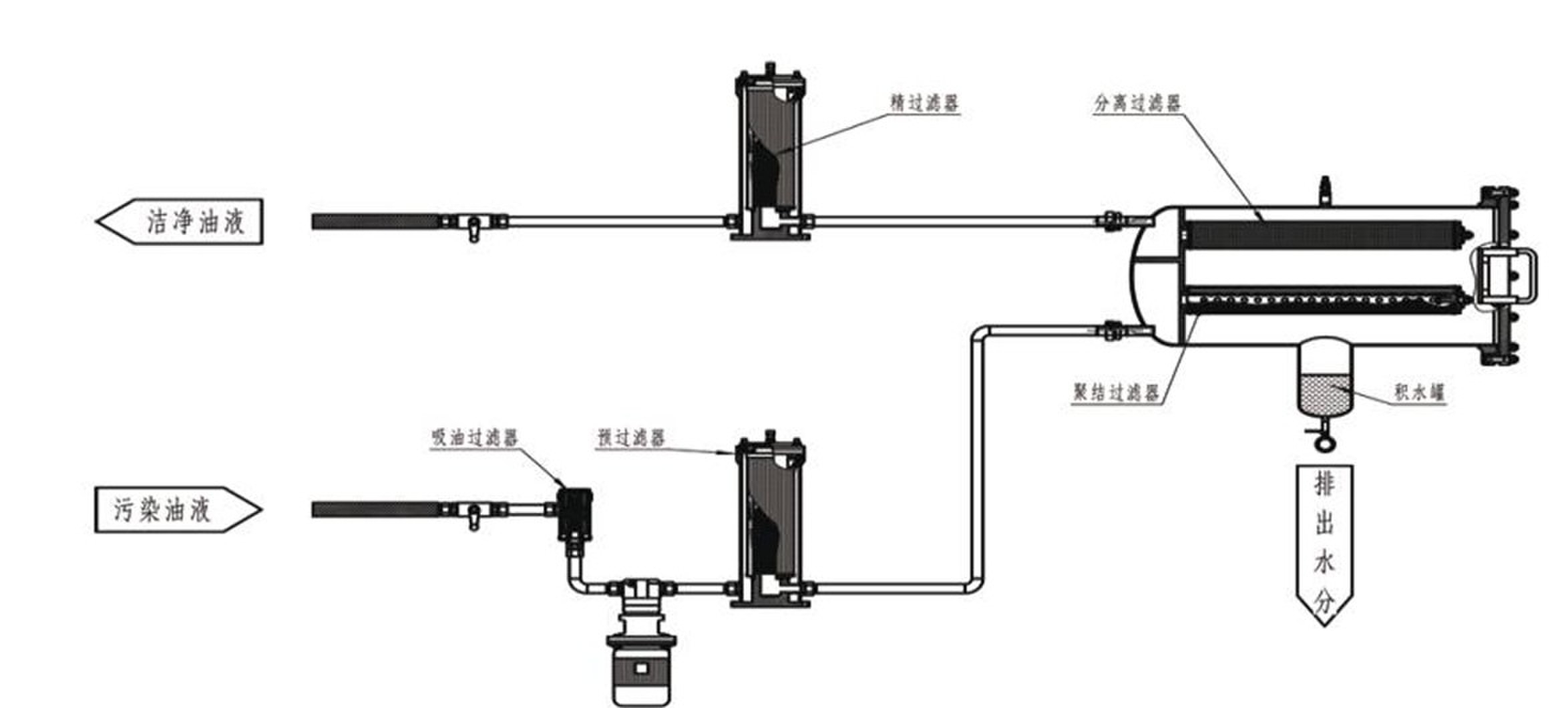 分離系統的分離濾芯由特殊的疏水材料制成,油液通過濾芯時,水珠被擋在濾芯的外表面,相互聚結直至因重力作用,沉降至儲水罐內。