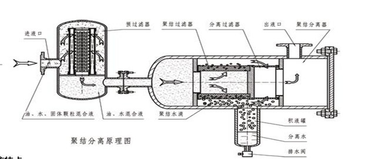 當不同的混合液體流入分離器后,首先進入聚結濾芯,聚結濾芯具有多層過濾介質,其孔徑逐層遞增。由于表面張力的差異,油液快速通過濾層,而水卻緩慢的多;又由于聚結濾芯采用親水性材料,微小的水滴更是吸附在濾層表面從而造成水滴的聚結。受動能的作用,小液滴競相通過開孔,逐漸匯成大的液滴,并在重力作用下沉降而與油液分離,通過聚結濾芯后的油液,仍有尺寸較小的水珠在慣性作用下向前至分離濾芯處。分離濾芯由特殊的疏水材料制成,在油液通過分離濾芯時,水珠被擋在分離濾芯的外面,而油液則通過分離濾芯,并從出口排出。
